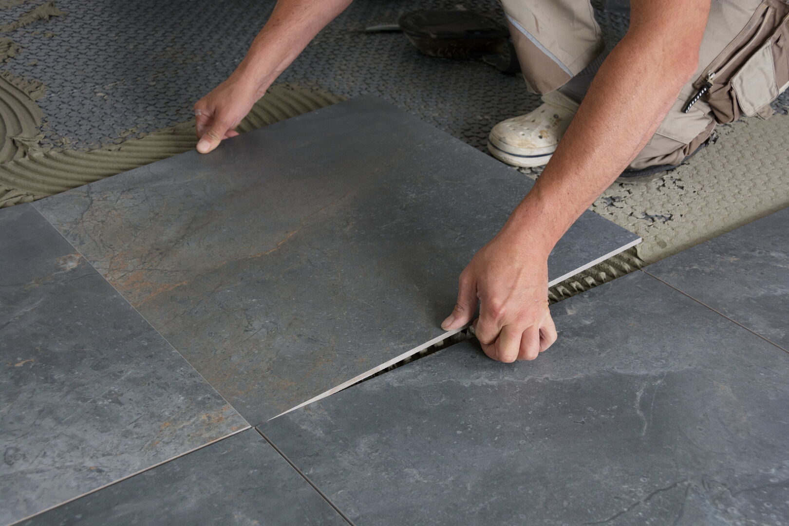 Vor jeder Verlegung prüfen wir sorgfältig den Bestand. Der Estrich muss ausreichend trocken und frei von Spannungsrissen sein. Die verfügbare Aufbauhöhe wird ebenso berücksichtigt wie die Frage, ob eine Fußbodenheizung integriert werden soll. Besonders bei Großformat-Fliesen oder Natursteinböden ist absolute Ebenheit unerlässlich. Bereits geringe Abweichungen können das Erscheinungsbild beeinträchtigen oder langfristig zu Spannungen führen. Millimeter entscheiden hier über die Dauerhaftigkeit und die optische Wirkung.