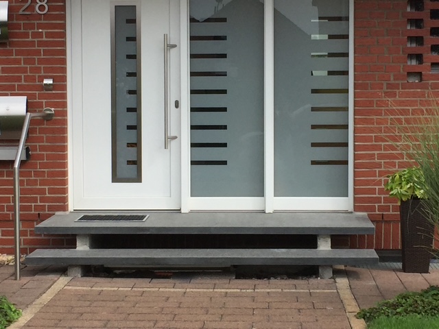 In älteren Wohngebieten im Raum Beckum, Dülmen und dem Münsterland zeigen sich häufig typische Schadensbilder. Stufen können abgesackt sein, einzelne Platten lösen sich oder es entstehen Rissbildungen in Fugen und Unterkonstruktion. In solchen Fällen analysieren wir zunächst die Ursache. Häufig liegt das Problem im Unterbau oder in einer unzureichenden Entwässerung. Eine rein optische Erneuerung würde das Problem nicht dauerhaft lösen. Erst wenn die konstruktive Grundlage stimmt, wird der Eingangsbereich neu aufgebaut. Ein Hauseingang wird täglich genutzt und ist ständig Witterungseinflüssen ausgesetzt. Er muss sicher begehbar sein und auch nach vielen Jahren stabil bleiben. Ziel ist eine Lösung, die funktional überzeugt und langfristig Bestand hat.