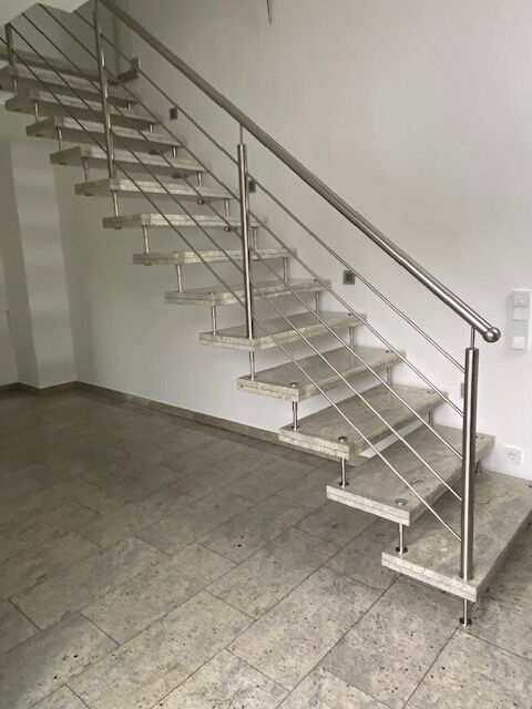 In vielen Häusern ist die Treppenkonstruktion aus Beton gefertigt. Im Rohbau wirkt sie funktional, jedoch noch nicht als gestalterisches Element. Durch einen Naturstein- oder Fliesenbelagbelag erhält sie eine hochwertige, langlebige Oberfläche, die sich harmonisch in das Gesamtbild des Hauses einfügt. Entscheidend sind präzise Stufenmaße, gleichmäßige Vorderkanten und eine exakte Ausrichtung aller Elemente. Die Oberflächen müssen rutschhemmend ausgeführt werden, insbesondere wenn die Treppe stark frequentiert ist. Natursteintreppen werden verklebt oder in Dickbett gesetzt. Die Verarbeitung erfolgt mit besonderer Sorgfalt, da bereits geringe Maßabweichungen im fertigen Zustand deutlich sichtbar wären.