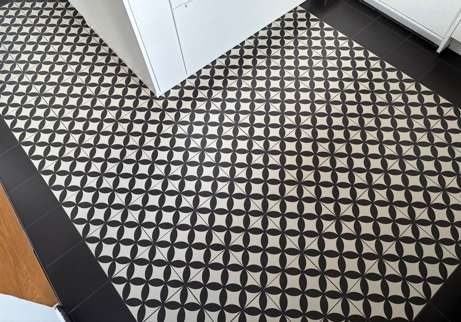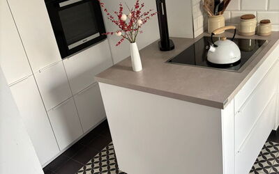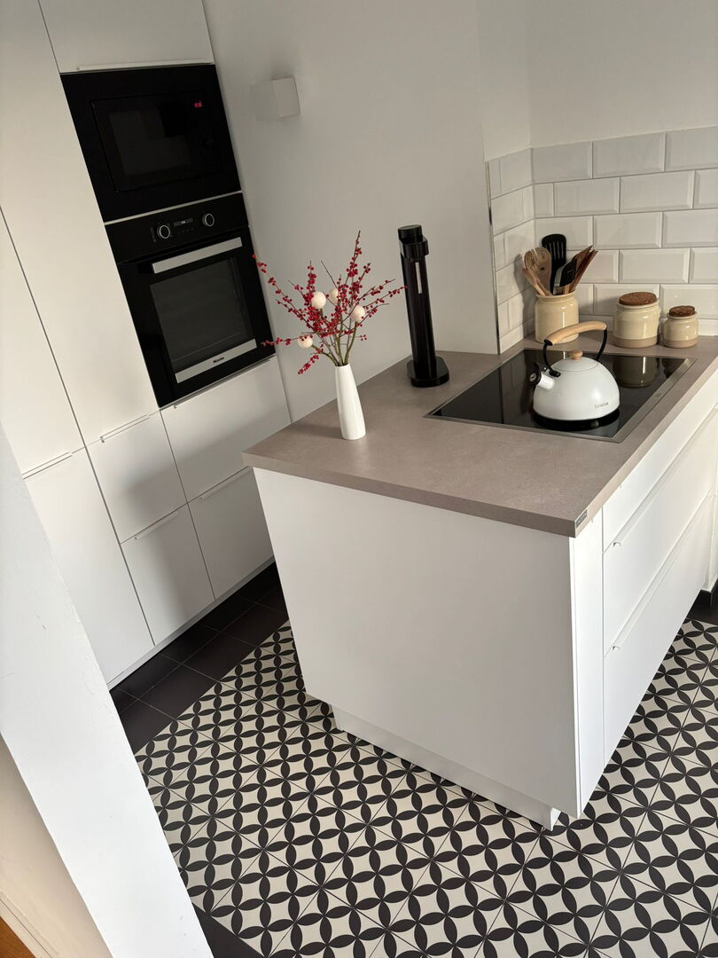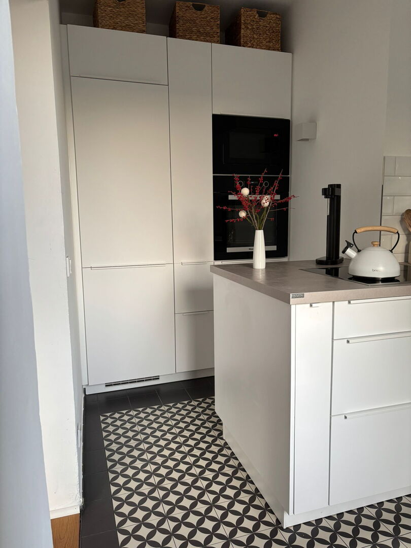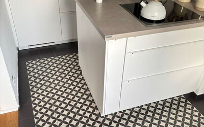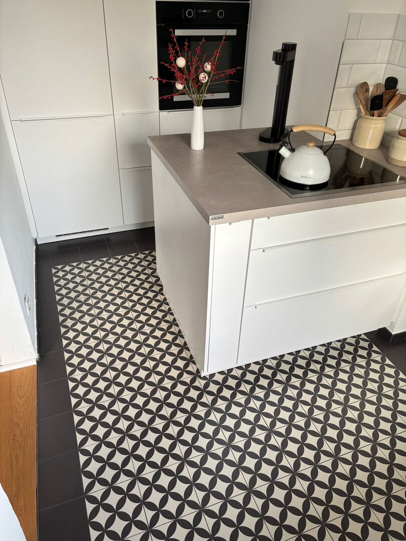 Auch der Boden setzt einen starken gestalterischen Akzent. Hier kamen handgefertigte Fliesen zum Einsatz, die durch ihr individuelles Muster und ihre besondere Optik dem Raum Tiefe und Charakter verleihen. Jede Fliese ist ein Unikat und trägt dazu bei, dass der Boden nicht beliebig wirkt, sondern eine eigene handwerkliche Wertigkeit erhält. Besonders in Küchen, Wohnbereichen und Sanierungsprojekten im Münsterland sind solche Fliesen eine gute Wahl, wenn Funktionalität und Persönlichkeit miteinander verbunden werden sollen.