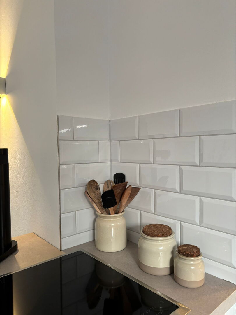 Bei diesem Küchenprojekt wurde der Küchenspiegel mit klassischen Metrofliesen ausgeführt. Die Fliesen wurden im Dünnbettverfahren präzise verlegt, wodurch ein besonders gleichmäßiges Fugenbild entsteht. Gerade in der Küche ist eine saubere und langlebige Ausführung entscheidend, da die Flächen täglich beansprucht werden. Perrone Naturstein aus Sendenhorst verbindet hier fachgerechte Fliesenlegerarbeit mit einem zeitlosen Gestaltungskonzept.
