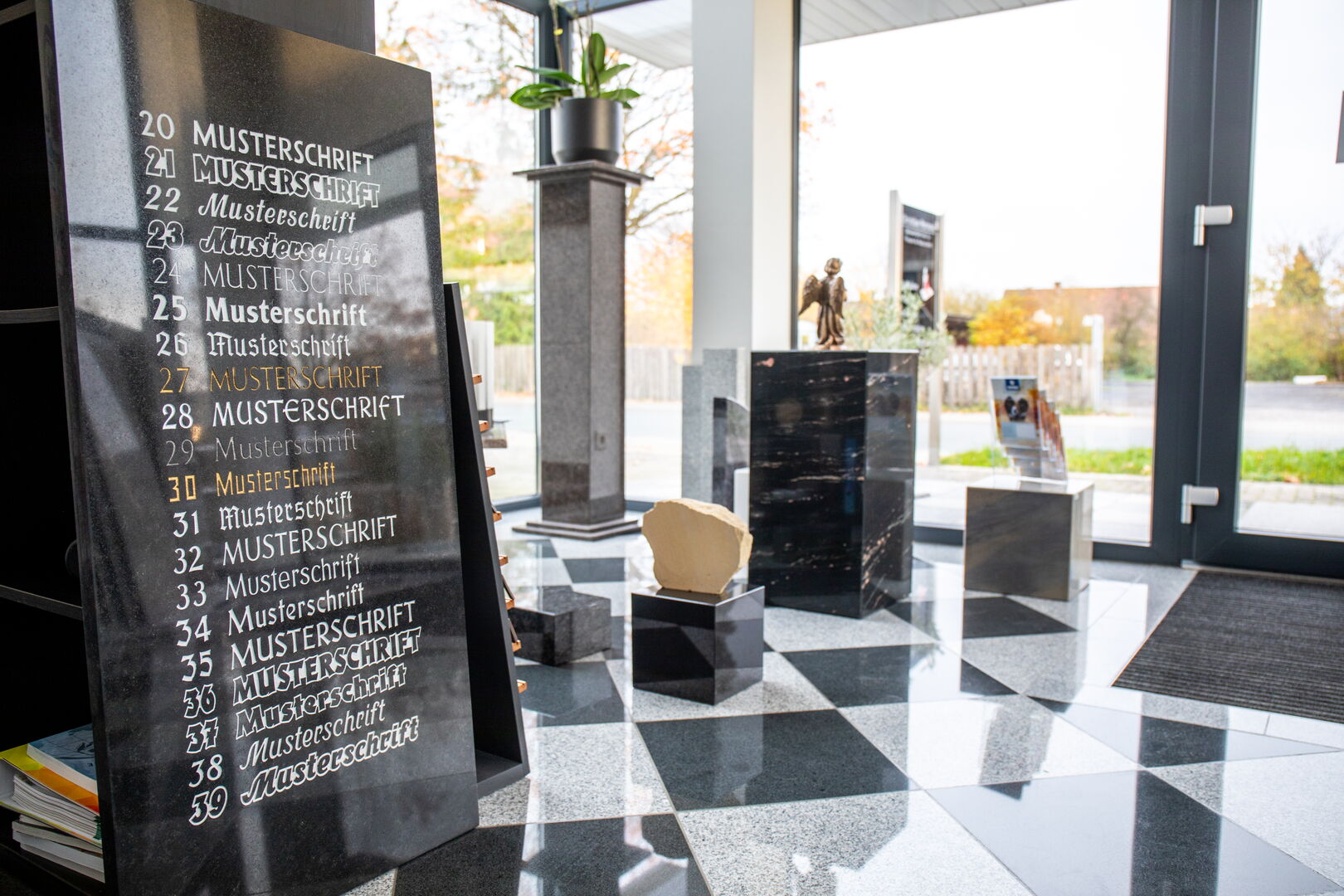 Die Beschriftung eines Grabsteins ist ein besonders sensibler Bereich. Hier geht es nicht nur um technische Ausführung, sondern um ein harmonisches Gesamtbild. Schriftarten, Buchstabenabstände und Ausführungstiefe müssen sorgfältig gewählt werden, damit der Text klar lesbar und stimmig wirkt. Möglich sind eingravierte Schriften, Bronze-Schrift, vertiefte Ausführungen mit Vergoldung oder moderne, zurückhaltende Schriftbilder aus Edelstahl. Jede Variante wird passend zum Material und zur Gestaltung ausgewählt. Besondere Sorgfalt ist erforderlich, wenn zu einem späteren Zeitpunkt eine Schriftergänzung vorgenommen wird. Wird ein weiterer Name hinzugefügt, müssen Abstand, Tiefe und Farbgebung exakt angepasst werden, damit die Ergänzung nicht als nachträglicher Zusatz erkennbar ist. Diese Arbeit erfordert Präzision und Feingefühl. Sie ist handwerkliche Detailarbeit, die mit der nötigen Ruhe ausgeführt wird: Grabschmuck, Laternen, Vasen, Kreuze und Skulpturen.