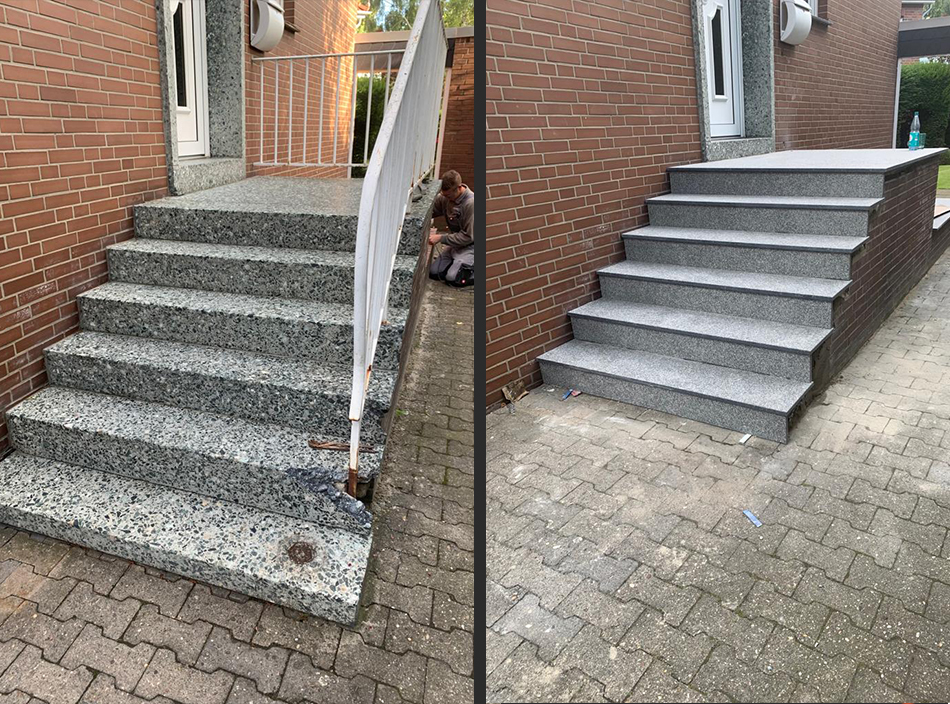 In älteren Wohngebieten im Raum Beckum, Dülmen und dem Münsterland zeigen sich häufig typische Schadensbilder. Stufen können abgesackt sein, einzelne Platten lösen sich oder es entstehen Rissbildungen in Fugen und Unterkonstruktion. In solchen Fällen analysieren wir zunächst die Ursache. Häufig liegt das Problem im Unterbau oder in einer unzureichenden Entwässerung. Eine rein optische Erneuerung würde das Problem nicht dauerhaft lösen. Erst wenn die konstruktive Grundlage stimmt, wird der Eingangsbereich neu aufgebaut. Ein Hauseingang wird täglich genutzt und ist ständig Witterungseinflüssen ausgesetzt. Er muss sicher begehbar sein und auch nach vielen Jahren stabil bleiben. Ziel ist eine Lösung, die funktional überzeugt und langfristig Bestand hat.